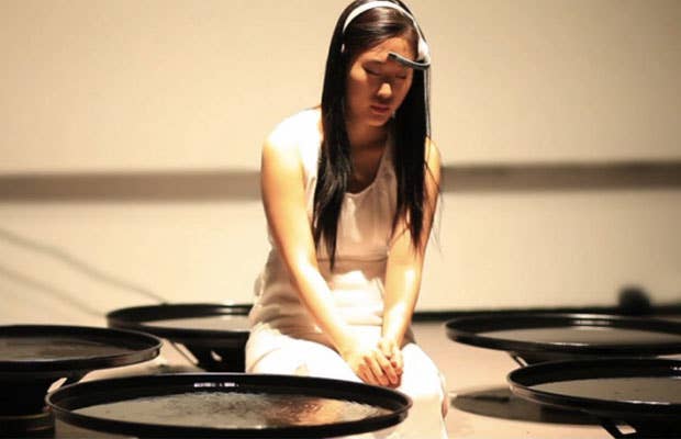 Artist Lisa Park was raised in Seoul, Korea, but is now based in New York, and creates art that deals with themes of "vulnerability, confrontation, suspension, self-control, and liberation." For her performance titled "Eunoia", Park focused on her thoughts as her brainwaves, detected by the EEG sensor she wore, caused vibrations to occur on water. The artist sat encircled by five pans of water that were each placed on top of a speaker, representing the emotions of sadness, hatred, anger, desire, and happiness. When the EEG sensor detected Alpha, Beta, Delta, Gamma, and Theta frequencies from Park's brain, the respective pools of water would vibrate, and create a deep and reverberating sound while ripples splashed across the surface.