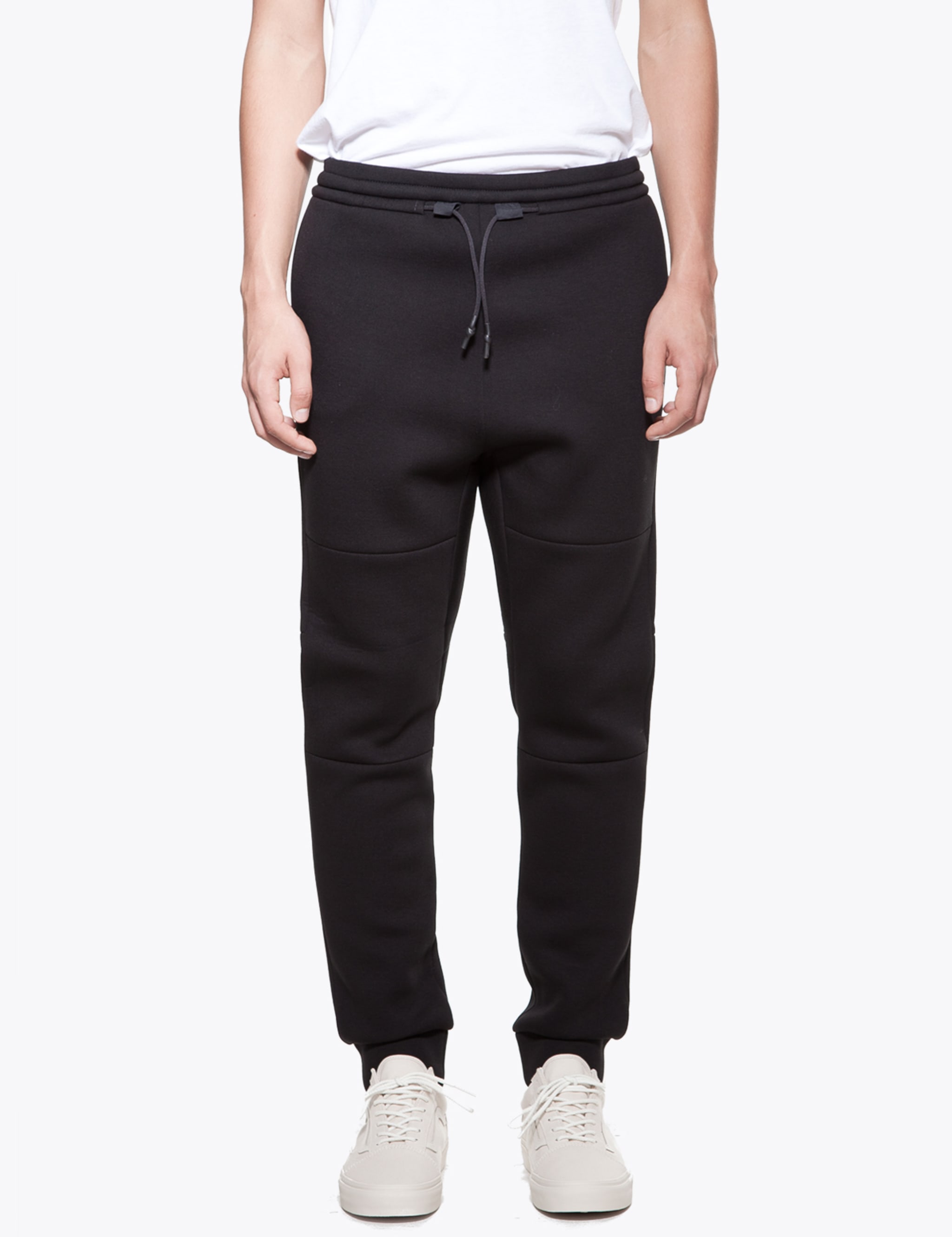 Hey, remember when I mentioned neoprene and how I was a little scared it might get popular? Well, I think it's already kinda popular. But it's appropriate in certain circumstances, like the upcoming winter. The biggest problem with sweatpants in the winter is that cotton jersey isn't particularly windproof, which means frozen junk. Windchill got not chill. Haha, excuse me for a second while I laugh at my own good ass joke for a second. Alexander Wang makes these Scuba Steve joints and Tres Bien sells them. I know Tres Bien is just tryna to show us the fit on these, but please, don't ever tuck your tee into your sweatpants, neoprene or otherwise. The piping on the pockets is a little tuxedo-y for might taste, but, again, no one will be seeing that detail as long as you're not a cornball with a tucked in tee.