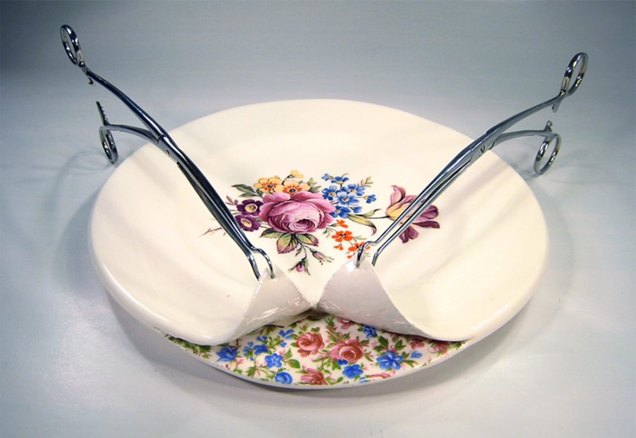 UK-based artist Beccy Ridsdel has been exploring the perception of ceramics in her most recent work, and this post-op tea set is a startling and slightly morbid contribution to that investigation. This series features delicate kitchenware in a vulnerable state. Each piece has an exposed inner layer of porcelain. The outer peels are often suspended by surgical clamps, as if surgeons began operating but abruptly stopped. The revealed areas are usually covered in ornate floral designs and patterns, suggesting that there is greater beauty in ceramic art than usually meets the eye. The series also disrupts gendered assumptions about ceramic art, pairing flowery designs with tools from medicine, a historically male-dominated practice.