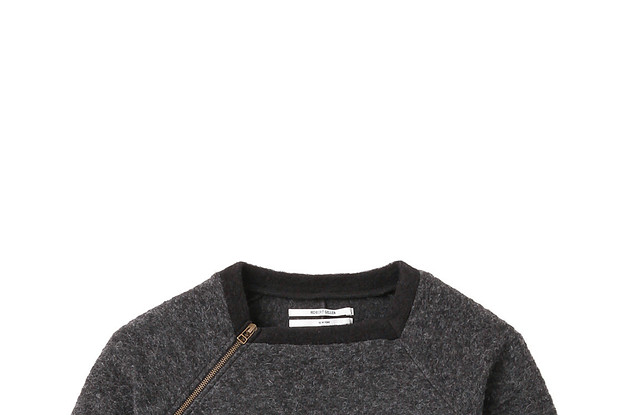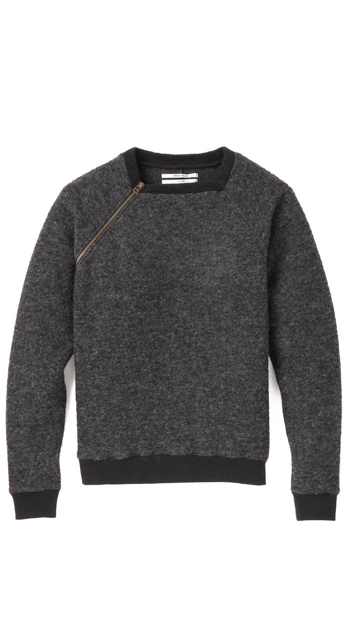 I have a feeling this Robert Geller zippered sweatshirt would make even the waifiest person look like they're built harder than a motherfucker. Maybe it's because raglans sleeves are pretty much the tits and make anyone look like they're in shape. Well, Robbie G dropped a zipper on one of the seams of said raglan sleeves and changed the game. It's weird to me how much more I like the asymmetry of one zipper vs. having, like, two matching zippers on a garment. There's just something about the haphazardness of it all. It's kind of philosophical the more I think about it. As human being, we have two arms, two legs, two eyes and all that shit. Anything we only have one of, like noses or bellybuttons, is in the middle of our bodies. Thus, dropping a single zipper on the side makes us feel like there should be a corresponding one on the other. ONLY THERE ISN'T *head explodes out of asshole*. It throws off the entire concept of what clothing should be. Sorry for the intro seminar about asymmetrical zipper fashion, but I felt it had to be mansplained for you fools.
