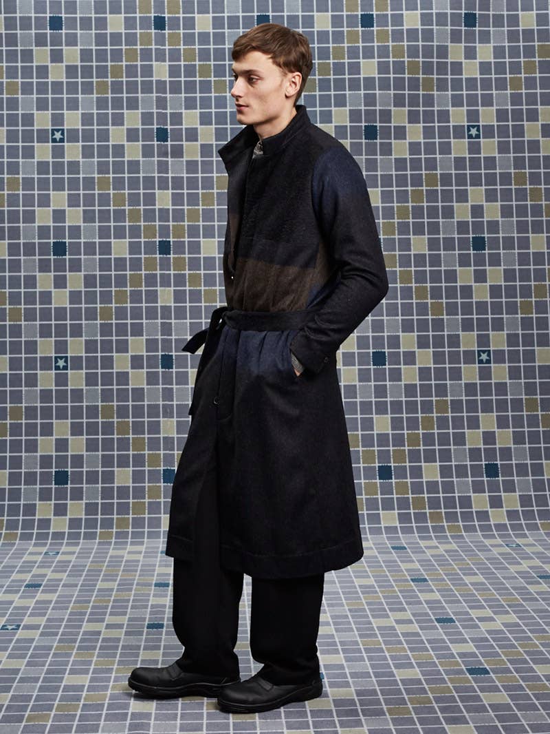 Stephan Schneider is a very specific brand. It's not crazy popular, but it's penetration rate amongst the menswear literati is strong. Schneider is the quintessential "awesome menswear brand that nobody knows about"...yet. It's not stocked in too many shops, so its presence at large is but a speck of dust on the menswear map. But that doesn't deter Stephan from slapping down a collection worth, like, 72 points in Scrabble. That's a good score, right? I'm terrible at Scrabble even though I write for a living and consider myself well-educated in terms of my vocabulary. Believe it or not, Schneider's F/W 15 line is actually inspired by Scrabble—you can see the board in the background of the lookbook throughout and in both small and large patterns on the clothes themselves. There are also a few close-up shots here, which is absolutely vital for a brand like Schneider. Most of his designs are subtle and intricate, focused on material and texture as much as shape and silhouette. You can see his strong knits and the slight variations between shades of blues and greens in detail. As far as standouts are concerned, the cropped, hooded, shawl collar coat and pair of plaid topcoats are just loud enough without being obnoxious, unlike, you know, somebody who beats your ass in Scrabble.