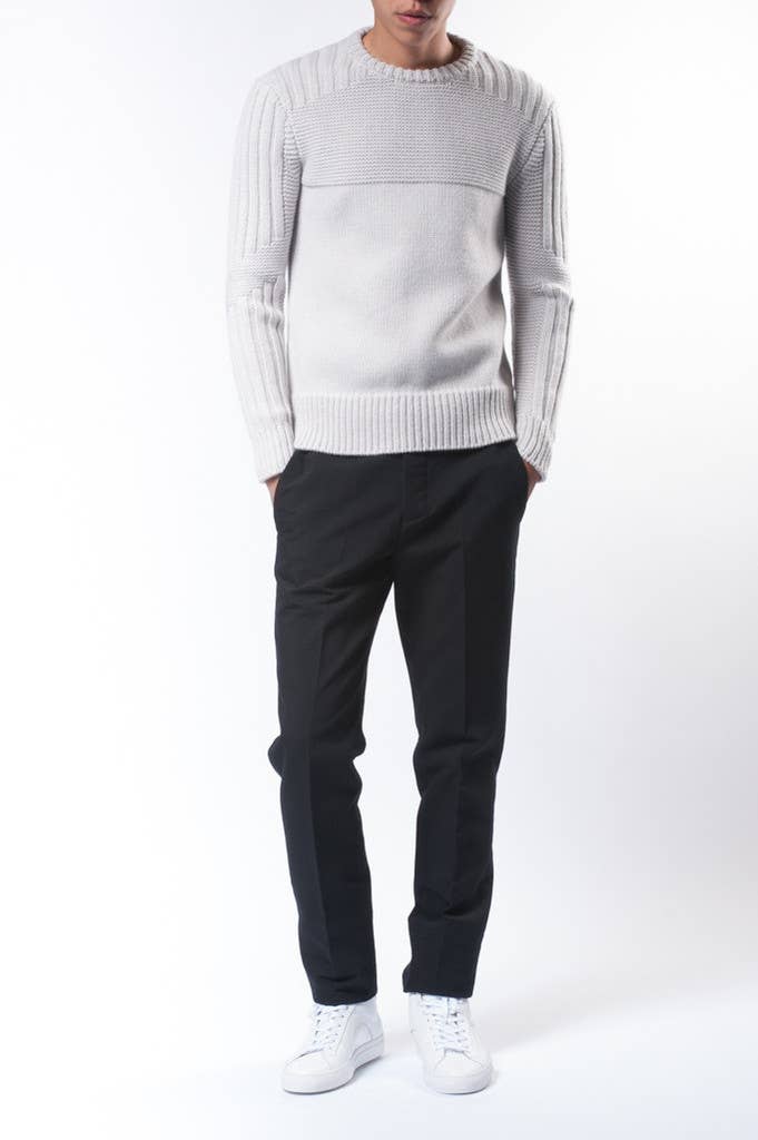 Another day, another $800 Tim Coppens sweater I attempt to talk myself into buying. I sometimes get caught up in the knitting patterns on sweaters. Do you see how many different textures are going on right here? It's absurd—big stripes, little stripes, big stripes intersected by little stripes. It feels like the type of thing only your mother could knit for you. When she starts out, you think, "Psh, it's never going to look good enough." But, by the end of the knitting process, she's made you a one of one, super fire sweater that looks like you'd spend $800 on it. The only problem is that it took her like a month to knit it, when you could have spent 30 seconds typing in your credit card and receive this one in three days instead. It's a serious trade off, but think about how proud you'll make your mom when you compliment her hard work. She had to put up with your middling ass your entire life. She's a fucking saint. See, the only thing she probably can't do is get her hands on this wool/cashmere blend. But, since she's a mom, she'd probably figure out a way. Moms always do.