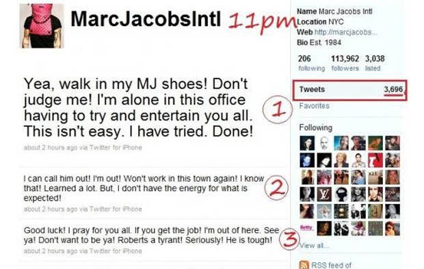 Yikes! Twitter can be a PR disaster when not used correctly—[see Exhibit A]. An intern at Marc Jacobs spent his last day at the job by tweeting with the company's own handle and shitting on the CEO, Robert Duffy. Read the tweets above! Apparently, Mr. Duffy is a very difficult to work for. But who knows? Maybe the small-town intern wasn't ready for the big city or the demands of the fashion world. Welcome to real life, kid.