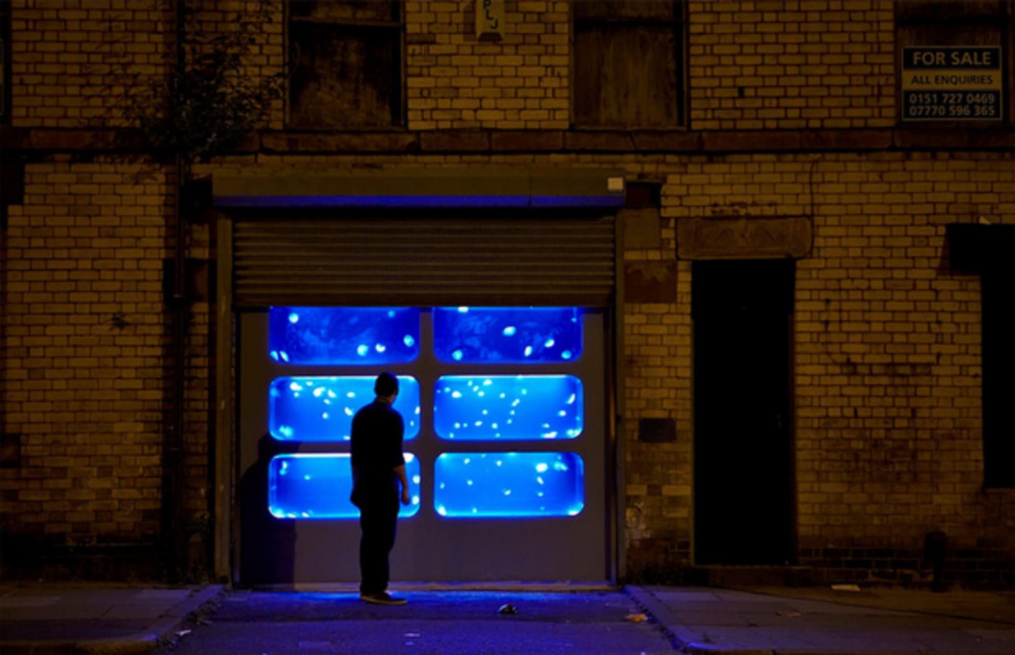 During the day, the property located at 53 High Park Street in Liverpool's Toxeth district looks like nothing more than an abandoned warehouse. Once night falls, however, the shutter of the building's garage rolls up to reveal a tank filled with live jellyfish, radiating with a mystifying blue light.